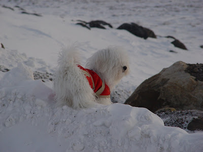 Boo and his red coat. This helps to keep him warm. The temperature when the photo was taken was around -20, but with no wind. We're thinking about getting him a warmer coat when we're home. We also have to get him some boots as the ones we have are too slippery.